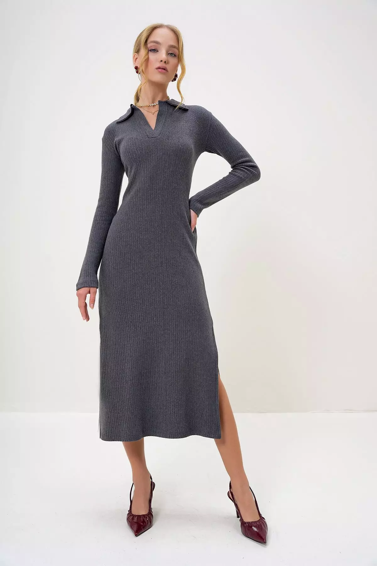 AlacatiWomen's Anthracite Polo Collar Half Placket Side Slit Interlock Fabric Dress159.00