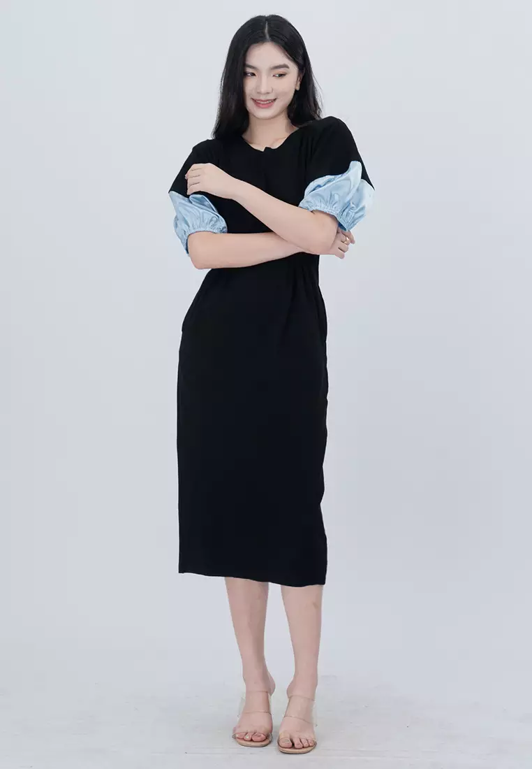 针织泡泡袖可伸缩中长款连衣裙