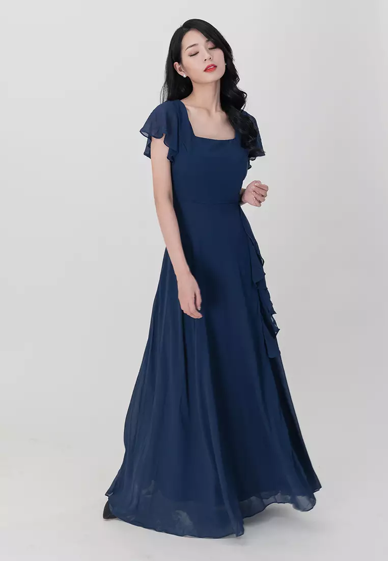 方领雪纺长裙开衩连衣裙