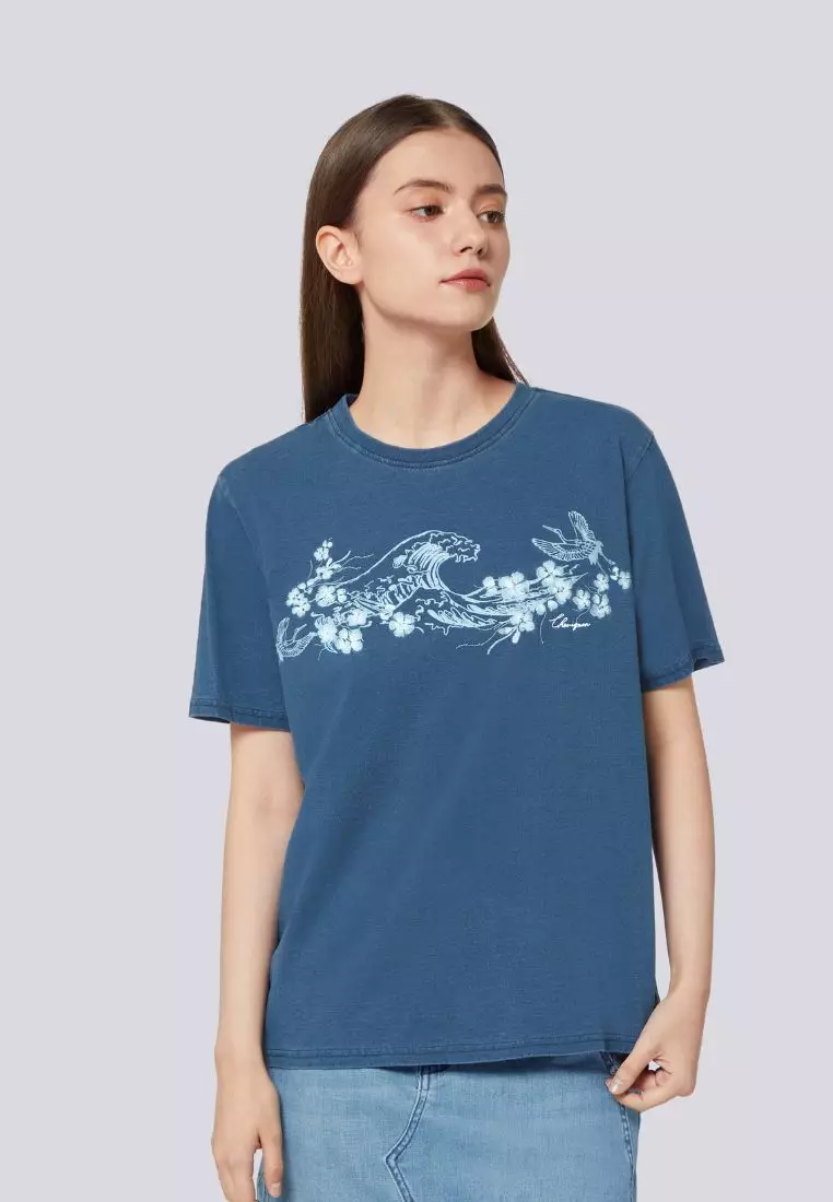 女裝櫻花印花靛藍染T恤