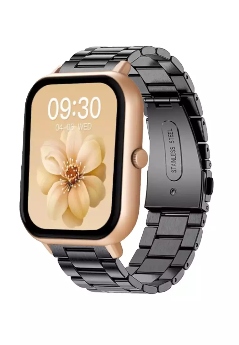 男女通用矩形智能手表 - IP 黑色不锈钢表带 + 1 条免费橡胶表带