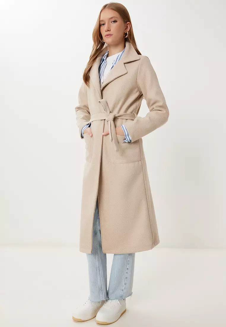 Women's Beige Double Breasted Collar Belted Cashmere Coat Mx00253