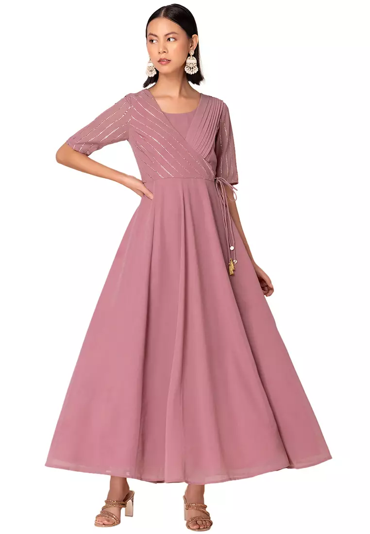 IndyaLight Pink Striped Foil Print Angrakha Kurta With Attached Dupatta638.00223.30