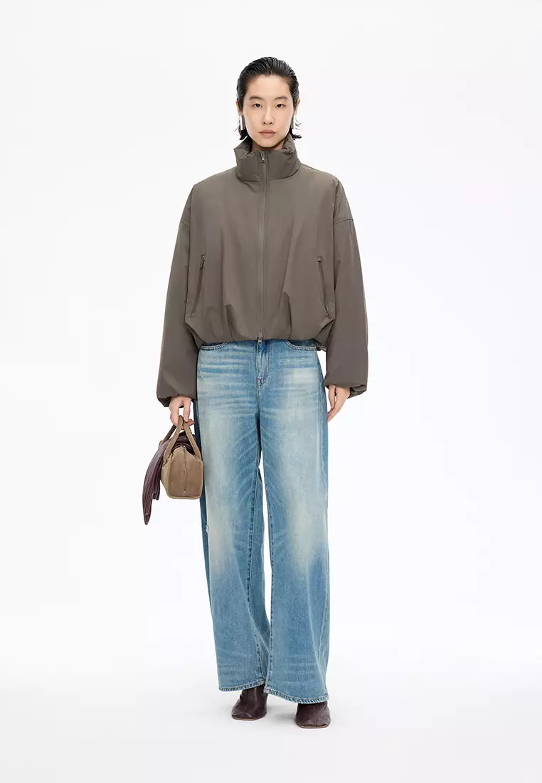 混紡90白鴨絨波浪形切線抽繩O型寬鬆短款羽絨服