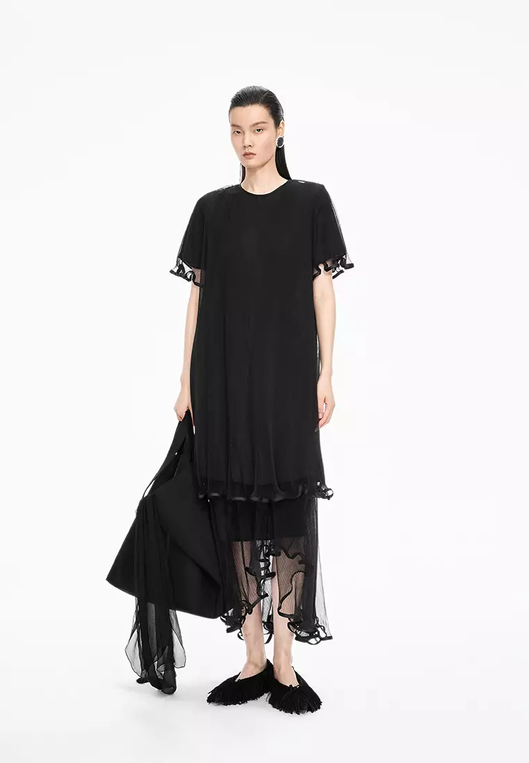 【轻礼服】混纺网纱A型压褶短袖连衣裙