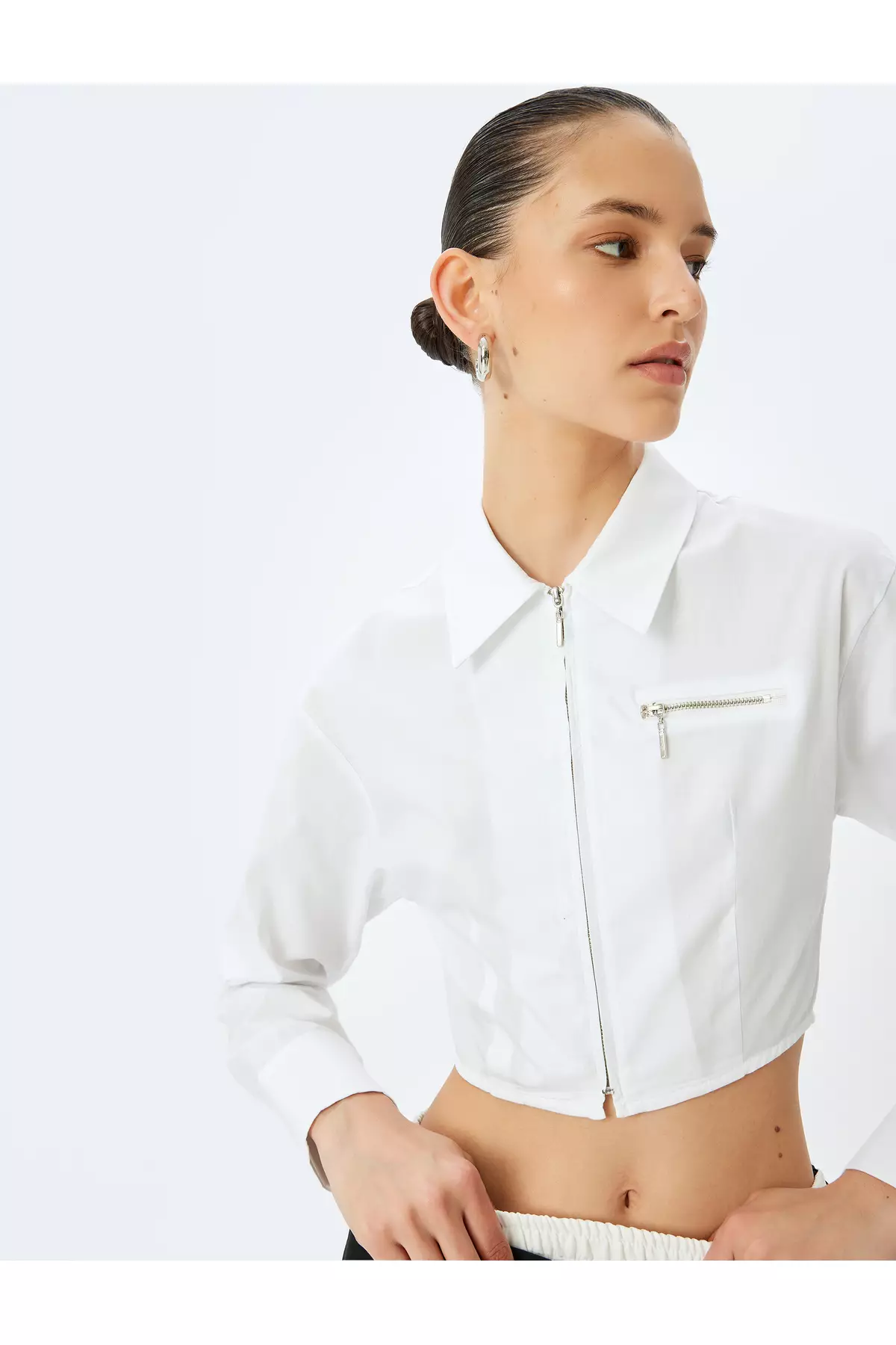 修身剪裁長袖恤衫領短版拉鍊恤衫