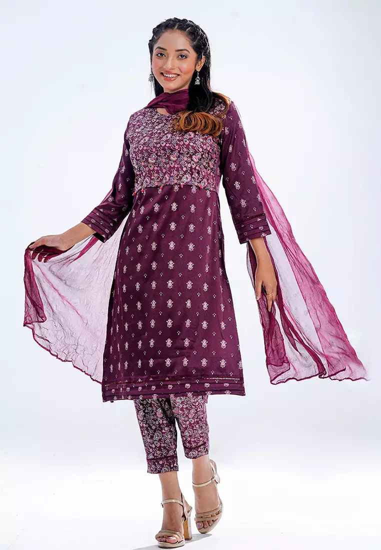 Tunic & Bottom: Crepe; Scarf: Chiffon