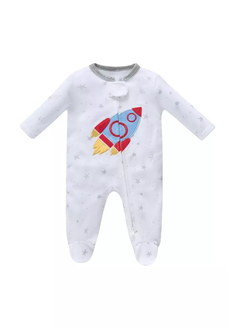 嬰兒男孩棉質連體睡衣 白色星星挖掘機 雙向拉鏈 連體衣