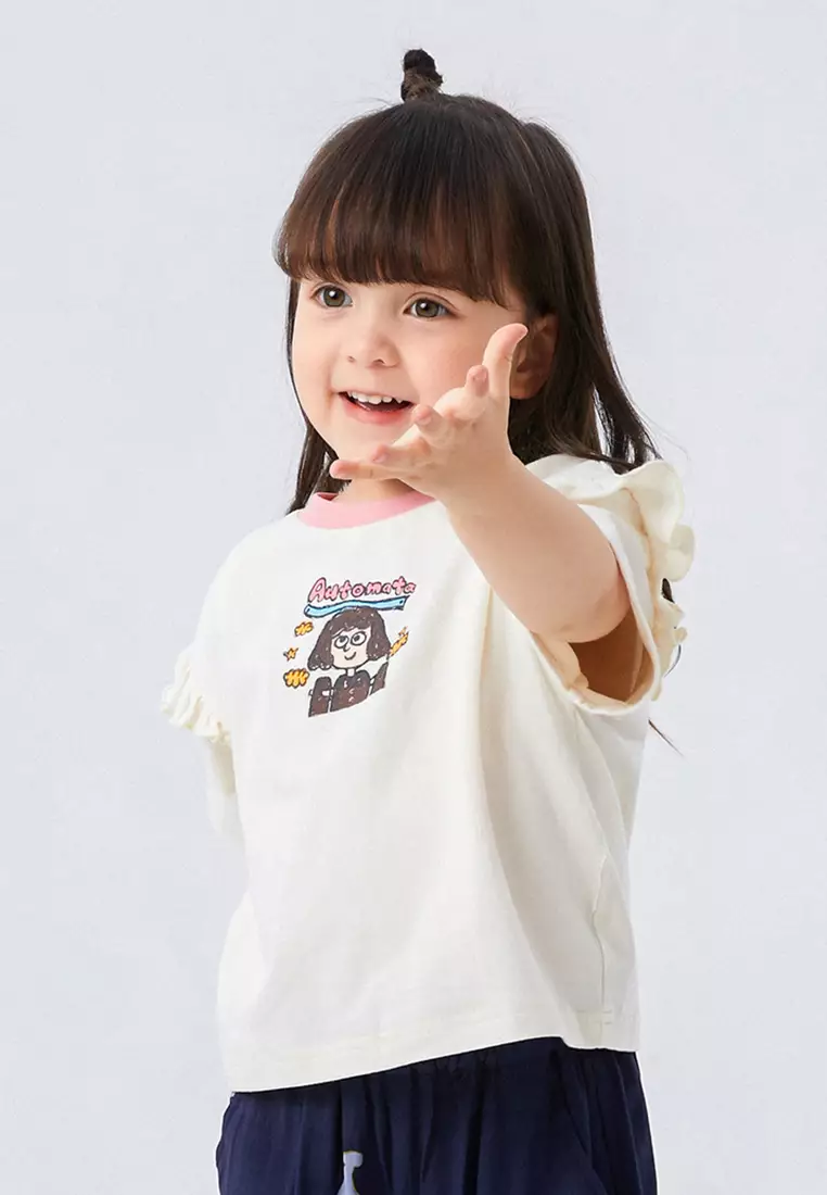 女小童短袖T恤趣味笔触感印花木耳边T恤
