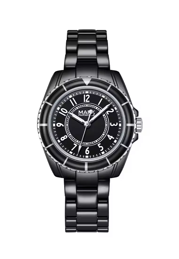 女士黑色陶瓷石英手錶,36mm,黑色錶盤,陶瓷手鐲
