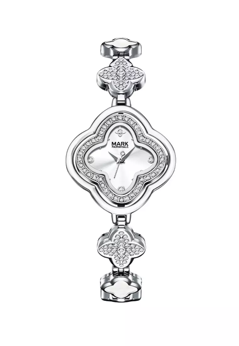 女士幸運四葉草不鏽鋼石英腕錶,鑲有水晶,金屬錶帶