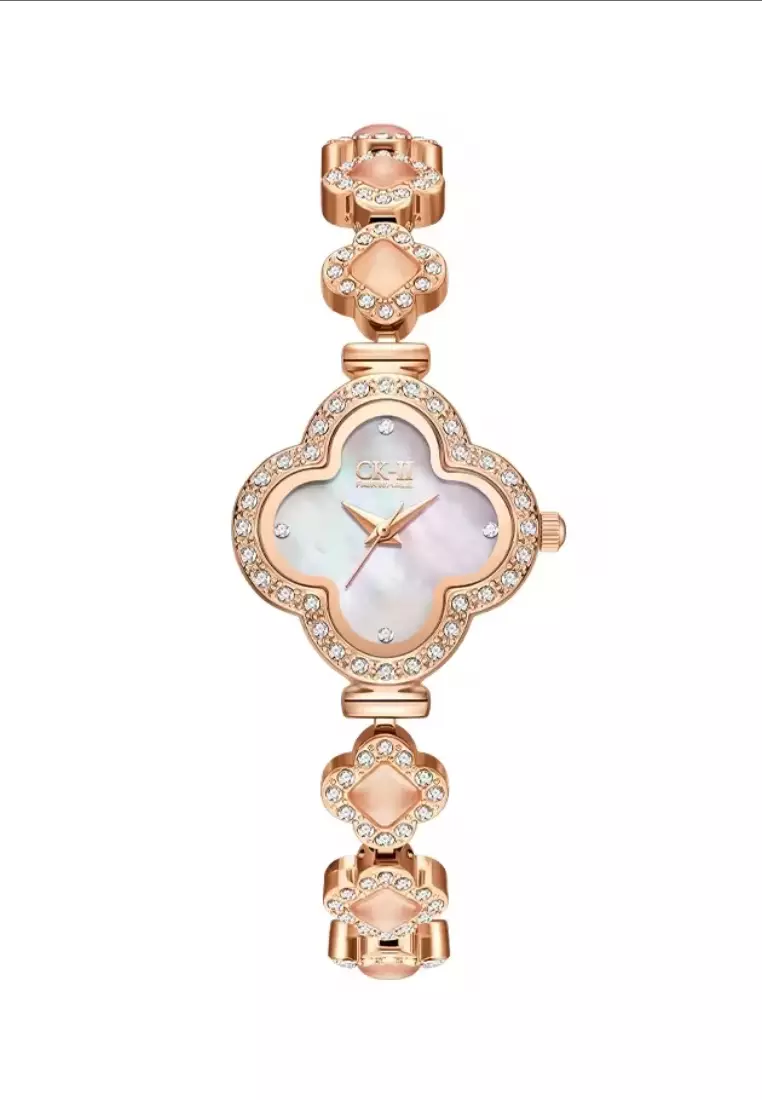 女士幸運四葉草不鏽鋼石英腕錶,鑲有水晶,金屬錶帶