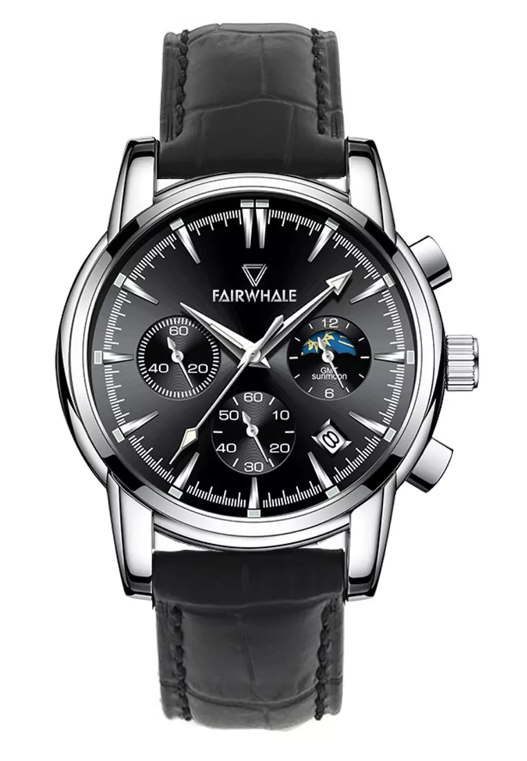 MarkFairWhale®中性不銹鋼計時碼石英表,黑色錶盤,40mm,黑色皮帶