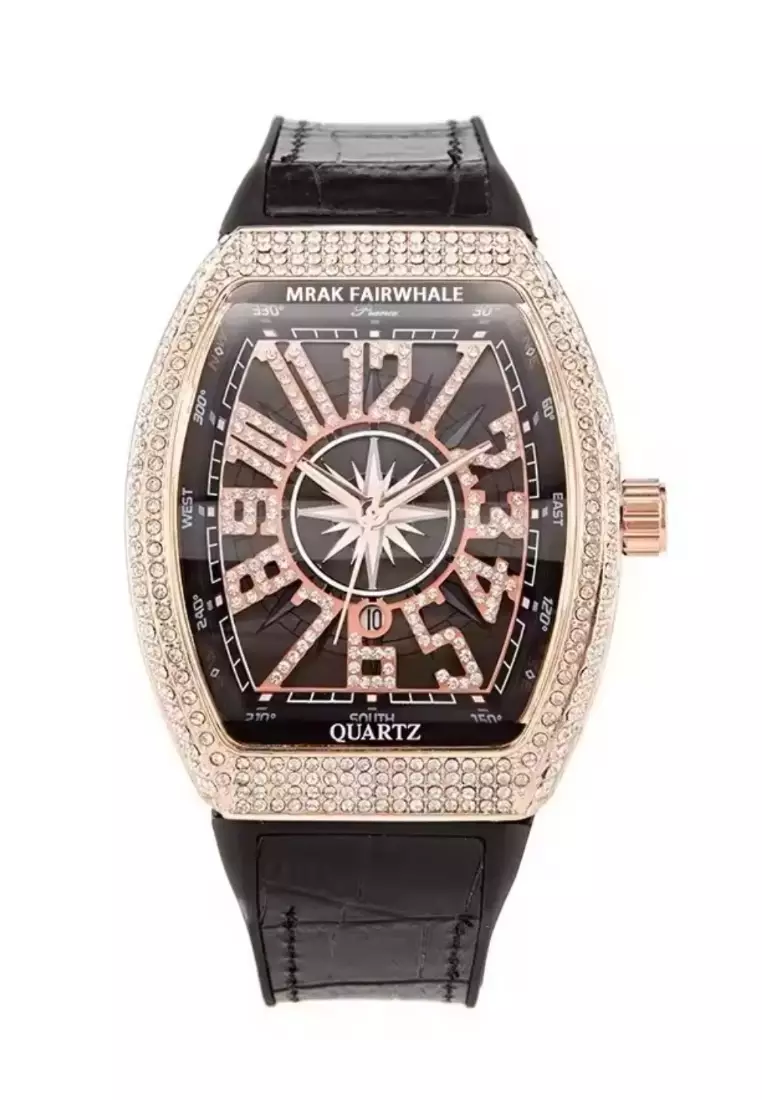 中性款酒桶形石英表,44毫米,黑色表盘,皮革表带