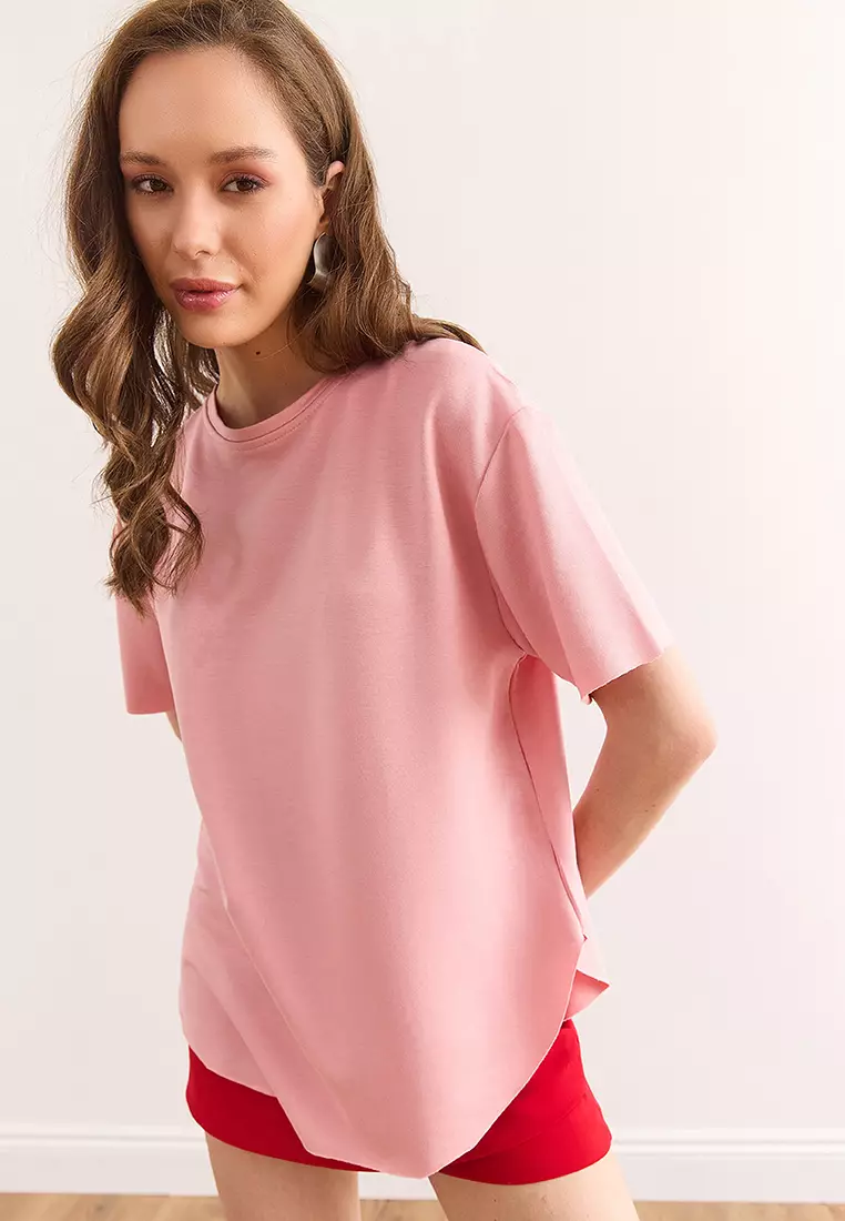 女裝粉末莫代爾紋理柔軟紋理六個橢圓形T恤 Tsh-19000771