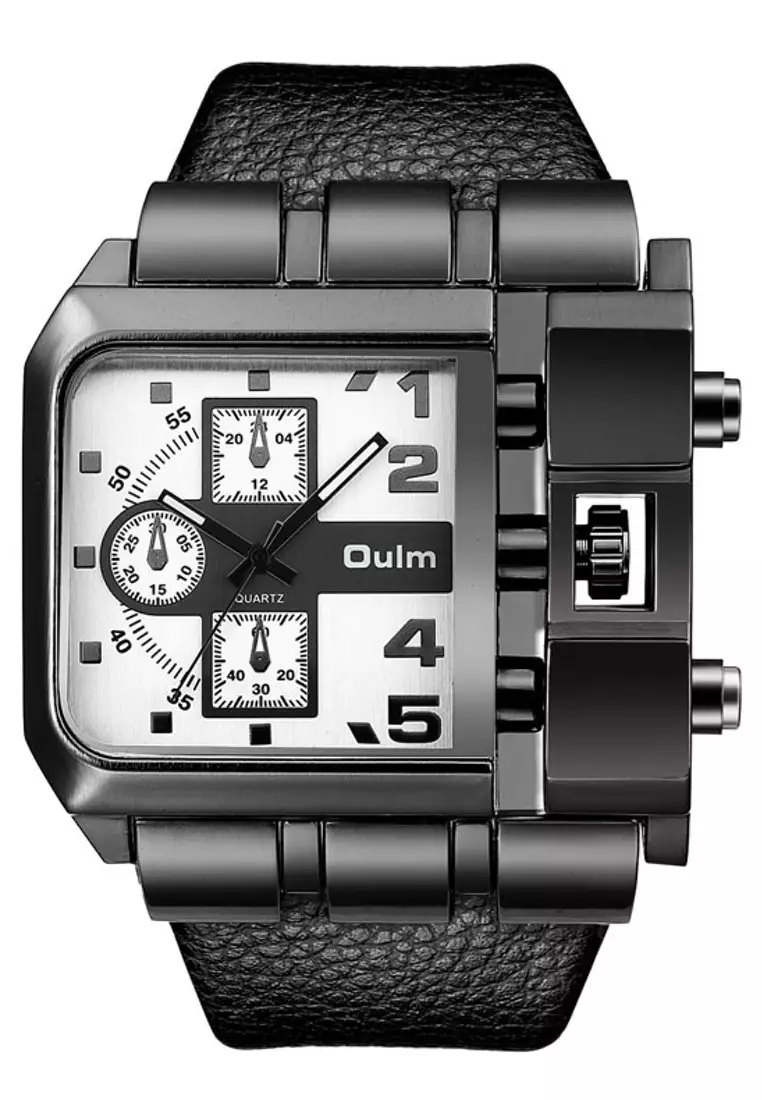 OULM超大號男士石英手錶 - 53x53 毫米 - IP 黑色精鋼錶殼,白色錶盤,黑色皮革錶帶1000.00299.00