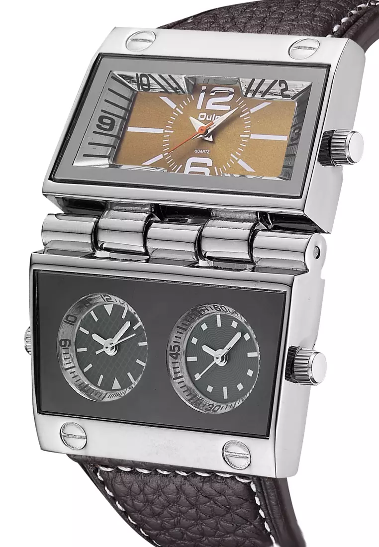 超大號男士石英腕錶 - 55x55 毫米 - 精鋼錶殼,棕色錶盤,黑色皮革錶帶