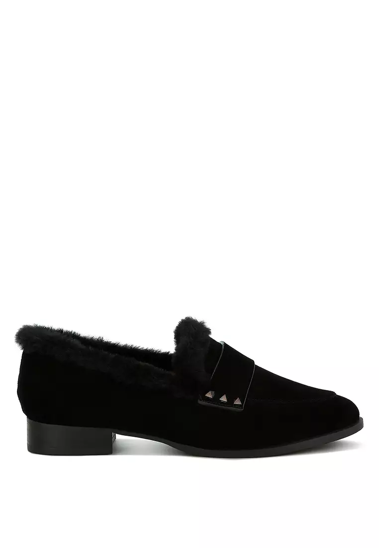 黑色毛皮飾邊絨面革樂福鞋