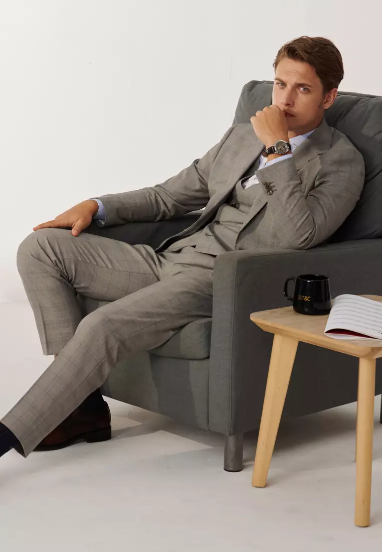 經典款淺灰威爾斯格紋修身西裝褲