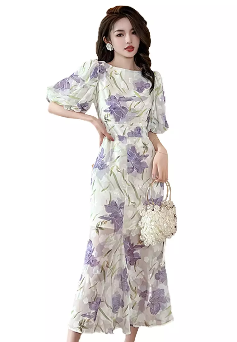 2025S/S夏季新款小清新氣質圓領泡泡袖印花魚尾連衣裙 CA061512