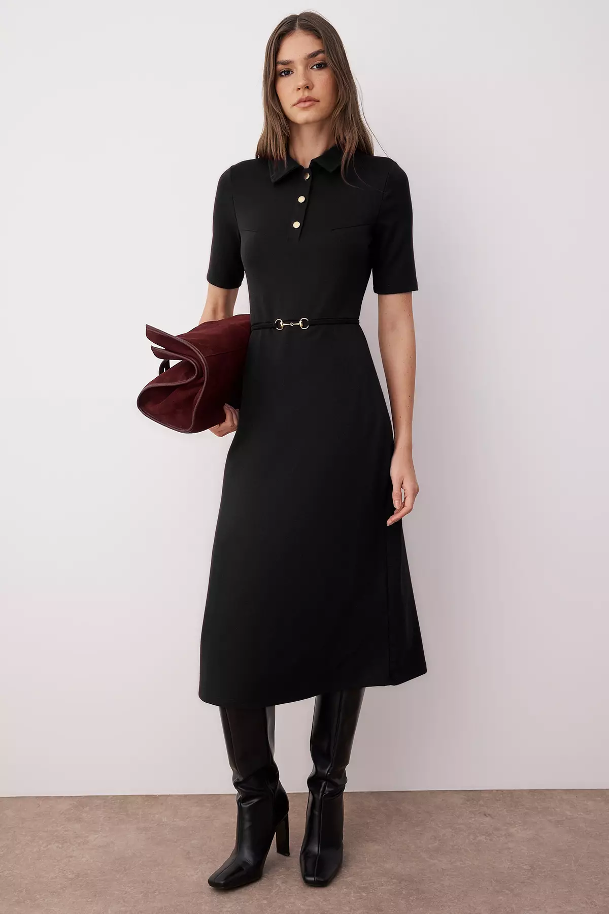 TrendyolBlack Belted Three Quarter Sleeve A-Line/Flared Plain Midi Knit Dress229.00