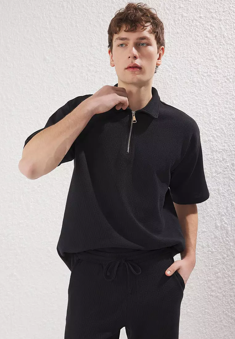 Black Oversize/Wide Cut Textured Zippered 100% Cotton Polo Neck T-shirt