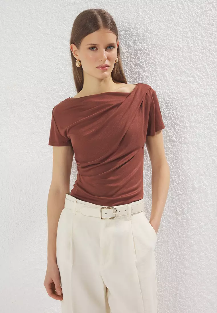 Brown Gather/Drape Detailed Fitted/Body Fitted Knitted Blouse TWOSS25BZ00278