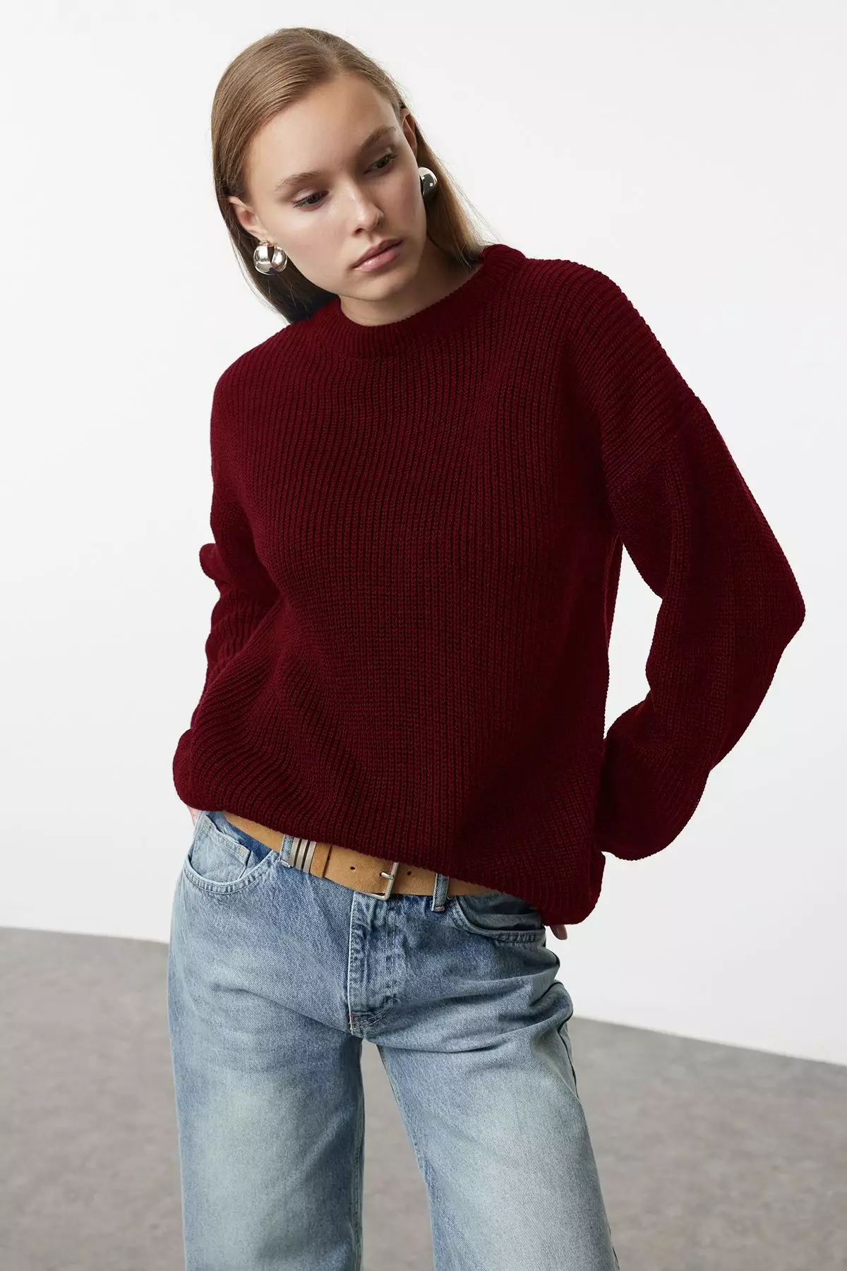 Claret Red Wide Pattern Ribbed Crew Neck Knitwear Sweater TWOAW25KZ00342