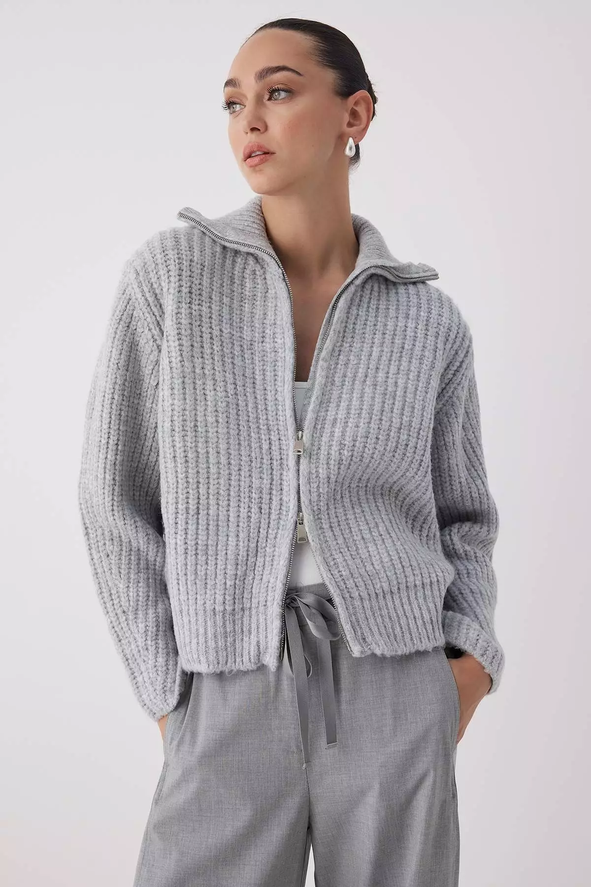 TrendyolGray Zipper Detailed Soft Textured Wide Fit Turn Down Collar Knitwear Cardigan389.00