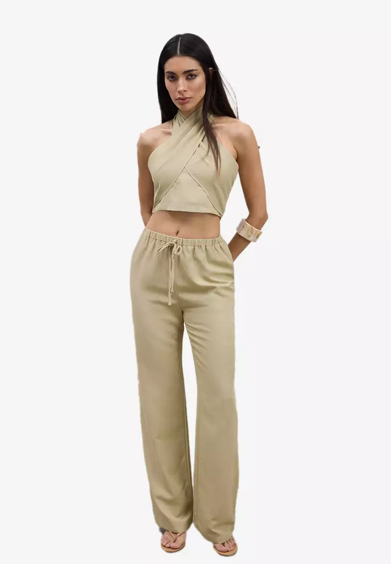 Light Khaki Linen Woven Blouse Trousers Top-Bottom Set TWOSS25AU00108