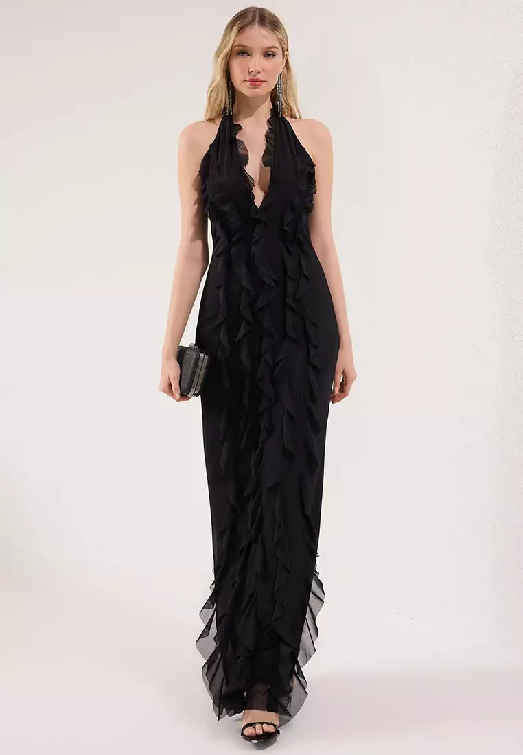 Limited Edition Black Ruffled Lined Tulle Evening Prom Dress TPRSS25AE00063