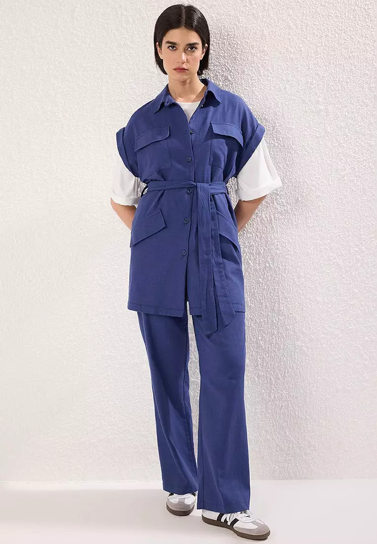TrendyolNavy Blue Linen Look Girdle Detailed Vest-Pants Woven Top and Bottom Set Tctss25Us00025389.00