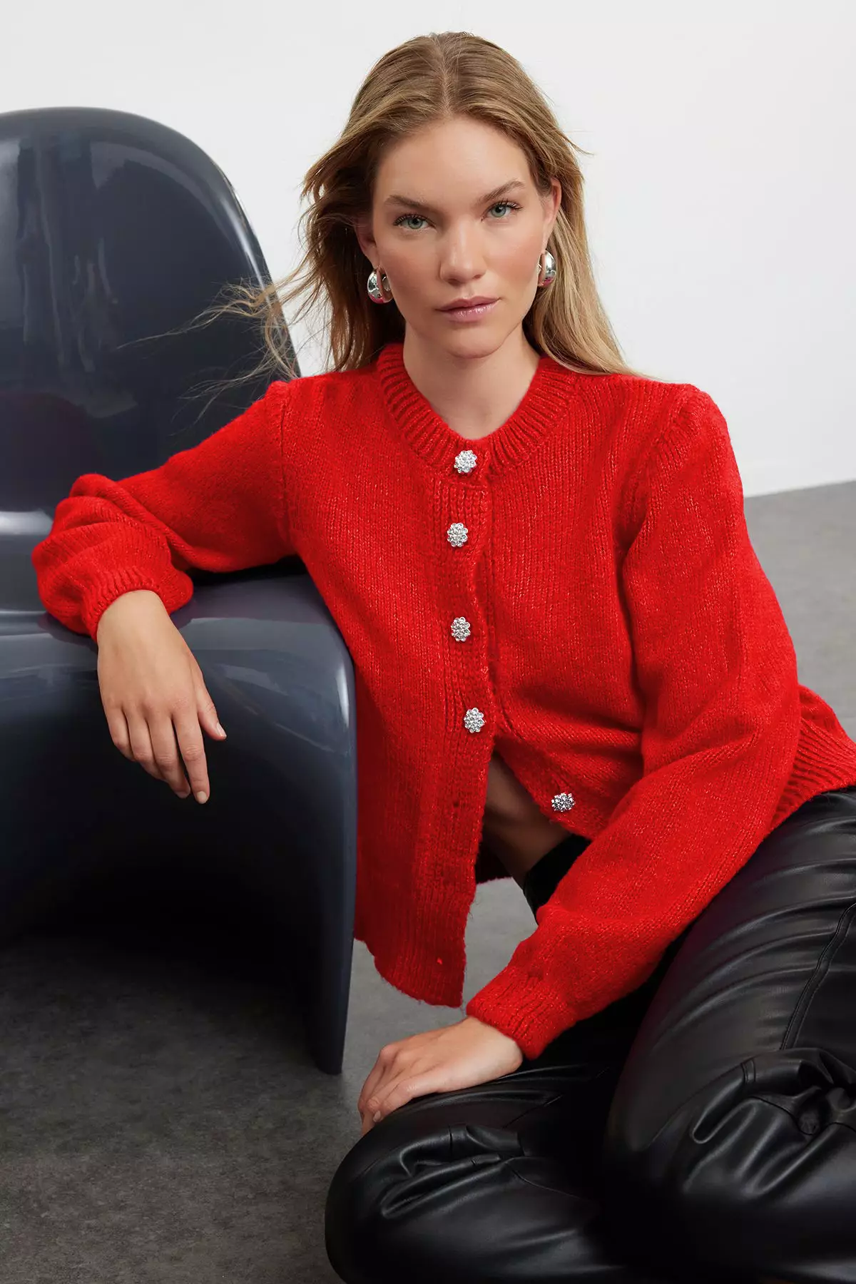 石榴花柔軟紋理寶石鈕扣外套造型針織外套