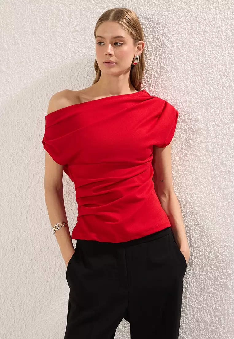 TrendyolRed Gathered/Draped Detailed Flowy Asymmetric Collar Knitted Blouse TWOSS25BZ00024119.00