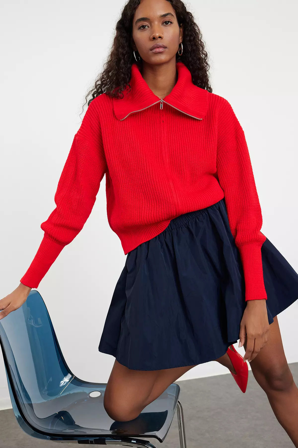 紅色闊身格仔翻領拉鍊針織外套 TWOAW24HI00072